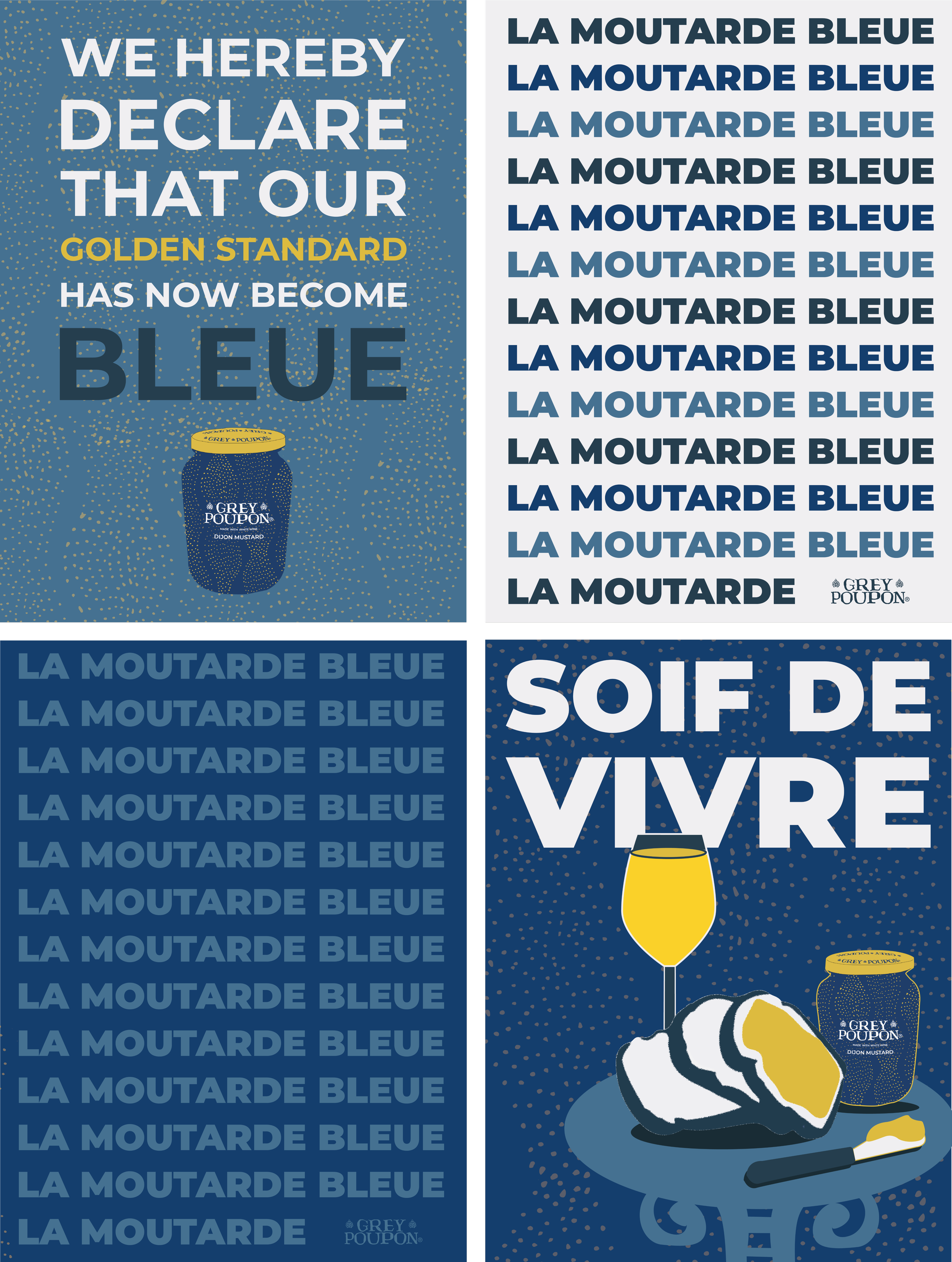 To distinguish Grey Poupon from a sea of yellow mustard, we challenged ourselves to reconnect with Grey Poupon's French roots and make Grey Poupon identifiable with the color blue. We took inspiration from French cobalt blue glassware, vintage French champagne posters, and the insight that members of the highest order of knighthood wore a blue ribbon. The term "cordon bleu" (blue ribbon) also ties to food prepared to a very high standard by exceptional cooks.