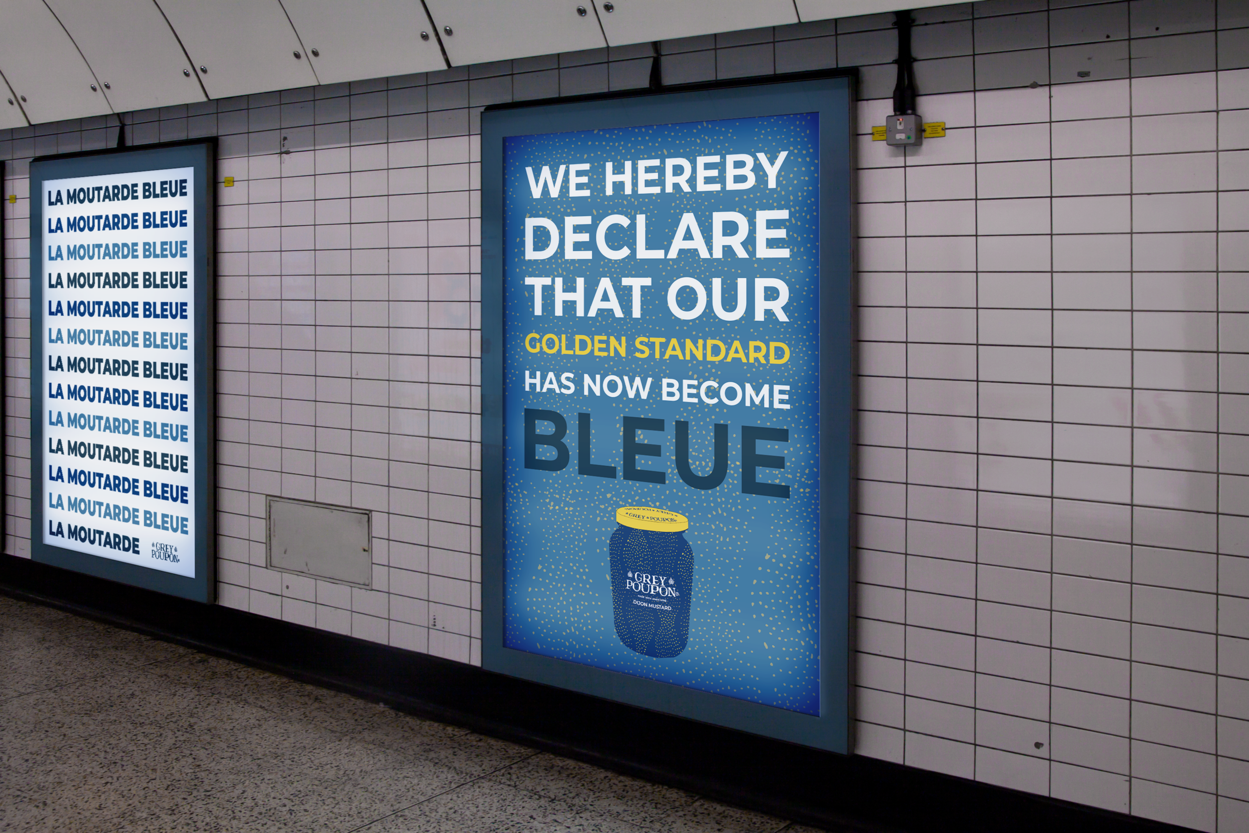 Real-world examples of how the Grey Poupon “Bleue Standard” looks on digital and printed platforms.