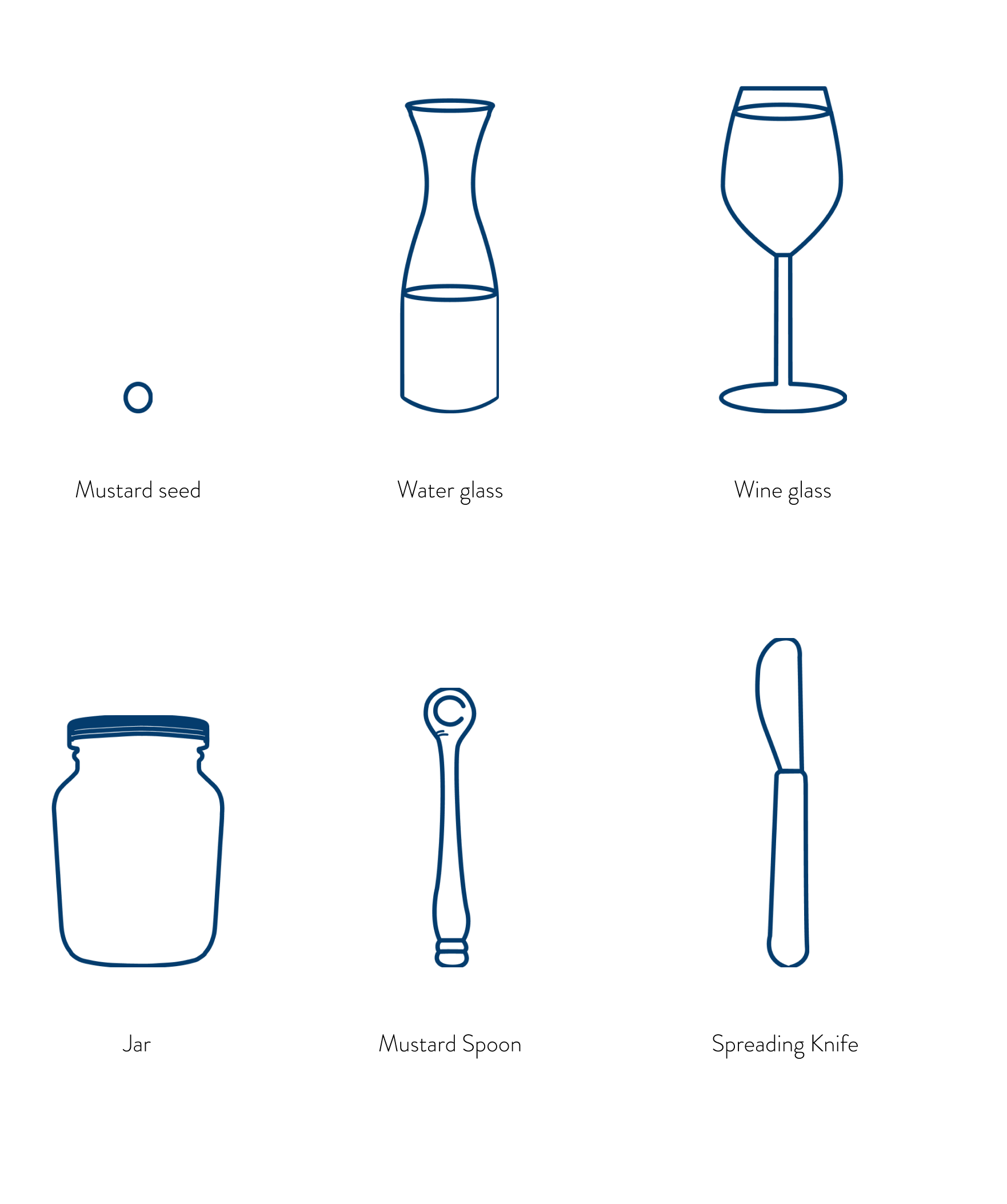 For Grey Poupon, we have six standard icons: the mustard seed, wine glass, and water glass resembling the three main ingredients of Grey Poupon Dijon mustard. The remaining icons are the signature Grey Poupon jar, a mustard spoon, and a spreading knife, essential tools for enjoying every last bit of Grey Poupon.