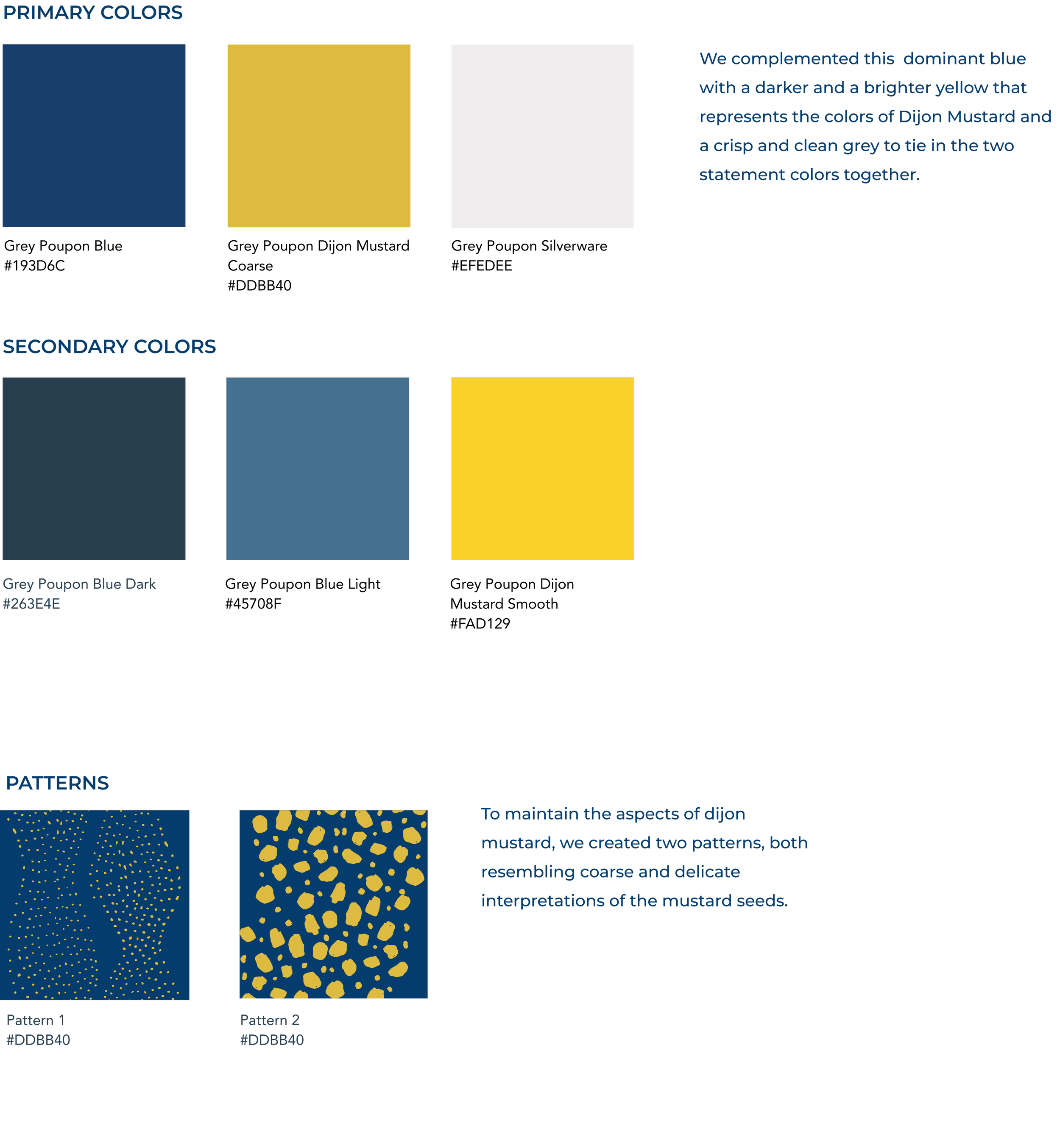 We complemented this dominant blue with a darker and a brighter yellow that represents the colors of Dijon Mustard and a crisp and clean grey to tie in the two statement colors together.